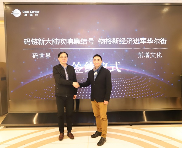 发布会的最后环节,由码链新大陆(纳斯达克代码CCNC)董事长兼CEO徐蔚代表码世界与紫增文化CEO张毅举行了签约仪式,全体参会人员见证了签约仪式并合影留念。