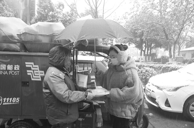 1月20日晚,南阳市迎来今年首场降雪,全市出现大风雨雪天气。为保证广大用户能及时收到邮件,南阳市的邮政投递员顶风冒雪坚持投递。图为1月21日早晨,桐柏县邮政分公司投递员克服路滑结冰等困难,将邮件投递到用户手中。 刘力扬 魏书雅 陈 萌 摄