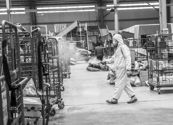 焦作市邮政分公司邮件分拨中心的专职消杀人员正在进行全场消毒工作。