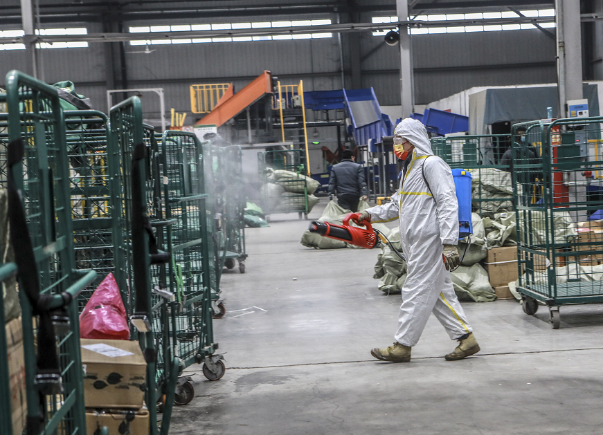 焦作市邮政分公司邮件分拨中心的专职消杀人员正在进行全场消毒工作。