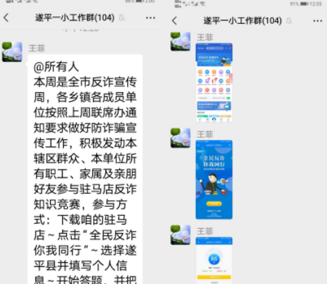 该校利用工作群向老师们传达了上级通知,要求班主任利用微信群通知家长和学生参加“全民反诈你我同行”知识竞赛。竞赛活动开始后,学校师生和家长见缝插针,利用休息时间,积极投入到知识竞赛中。家长们把自己和学生的竞赛成果展示在班级微信群中,不仅支持了学校的工作,还提高了学生的学习能力,拓宽了学生的视野。