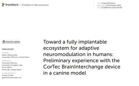 近期,天桥脑科学研究院(TCCI)应用神经技术前沿实验室主任Gerwin Schalk以第一作者和通讯作者的身份在Frontiers in Neuroscience杂志上发表题为《Toward a fully implantable ecosystem for adaptive neuromodulation in humans: Preliminary experience with the CorTec BrainInterchange device in a canine model》的文章,展示了建立人类自适应性神经调控系统的初步工作。