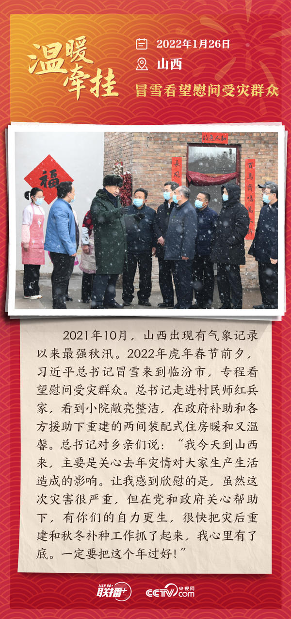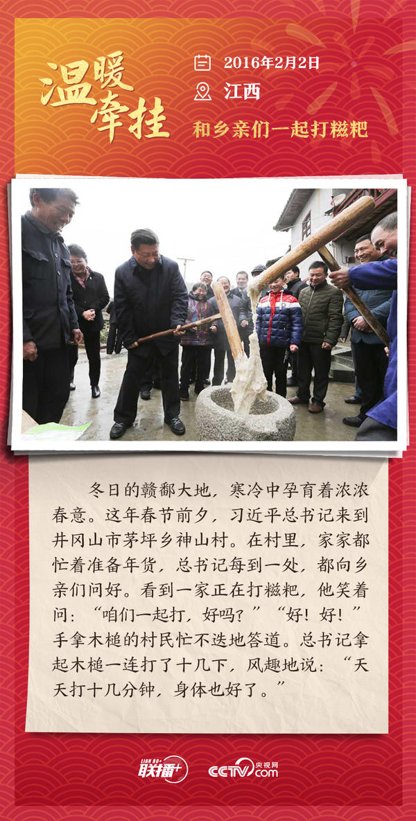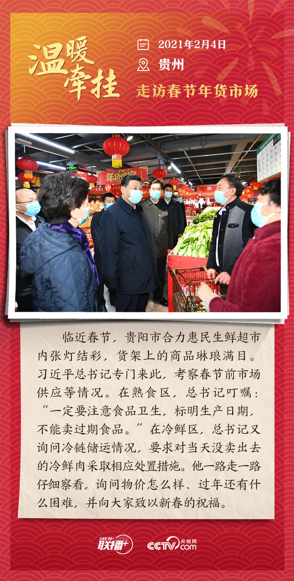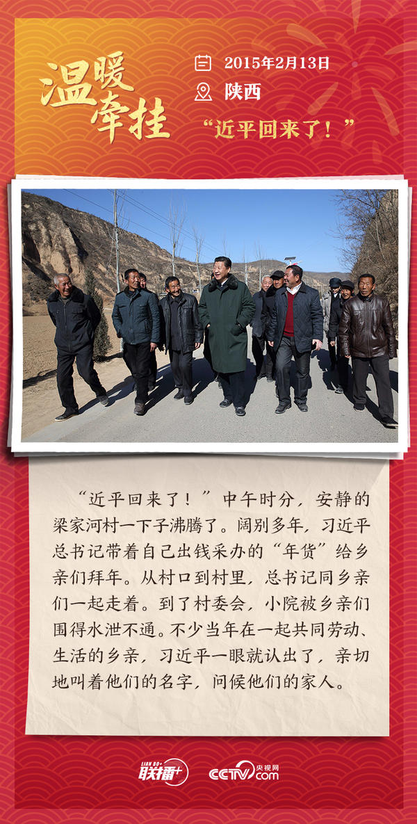 编者按:“大国之大,也有大国之重。千头万绪的事,说到底是千家万户的事。”从2013年起,每逢春节前夕,习近平总书记都会来到群众身边,拉家常、问冷暖,听民声、送祝福。央视网《联播+》特推出“温暖牵挂”系列,与您一同重温总书记与大家在一起的温暖故事,感受浓浓的领袖情怀。