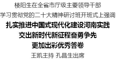 2月15日,全省市厅级主要领导干部学习贯彻党的二十大精神研讨班在省委党校(河南行政学院)开班。省委书记楼阳生在开班式上作讲话,强调要深入学习贯彻习近平新时代中国特色社会主义思想和党的二十大精神,深刻理解把握中国式现代化的内涵和本质,扎实推进中国式现代化建设河南实践,向着“两个确保”勇毅前行,在新时代新征程上交出奋勇争先、更加出彩的优秀答卷。省长王凯主持,省政协主席孔昌生出席。