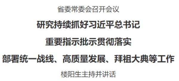 2月17日,省委常委会召开会议,传达学习中央政治局常委会会议精神,研究持续抓好习近平总书记重要指示批示和中央八项规定精神贯彻落实,部署统一战线、高质量发展、国家区域医疗中心建设、癸卯年黄帝故里拜祖大典等工作。省委书记楼阳生主持并讲话。