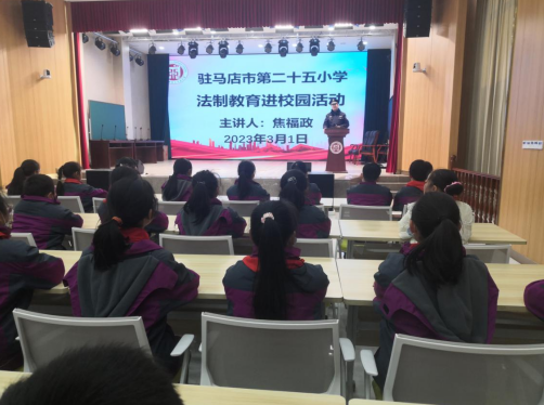 为深入学习贯彻习近平法治思想,大力弘扬社会主义法治精神,进一步维护青少年合法权益,预防和减少未成年人违法犯罪,为青少年的健康成长营造良好的法治环境,3月1日下午,驻马店市第二十五小学开展法制教育进校园活动。