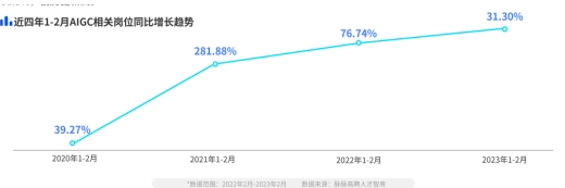 随着AIGC带来的职场变革,近两年,AIGC领域岗位数量井喷增长。2021年是AIGC人才招聘需求增长爆发期。2021年1—2月,AIGC领域岗位数量同比暴增281.88%。随着ChatGPT走红,2023年1—2月AIGC人才招聘需求数量同比上涨31.3%,创历史新高。