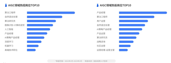 但AIGC人才的供需结构存在失衡现象。在需求端,AIGC领域热招岗位以技术岗位为主,算法工程师、自然语言处理、图像识别等研发人才需求旺盛。而在供给端,AIGC领域热投岗位则以AI产品经理类、运营类等非技术岗位居多。