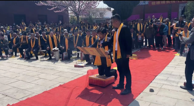 上午十时,神位入座暨拜祖大典正式拉开帷幕。首先有归德田氏族人代表田启义、河南省姓氏文化研究会田姓委员会会长田广生和商丘市姓氏文化研究会常务副会长卢启印先后致辞。田启义在致辞中,对归德田氏举行这次家族活动的深远意义给予了肯定,并呼吁、倡导大力弘扬“紫荆精神”,加强团结,建设和睦家庭,促进社会和谐。田姓委员会和市姓氏文化研究会,对归德田氏举办传承优秀传统文化活动表示祝贺,对近几年取得的成就给予肯定。接着是神位入座,各门支的后世子孙,手捧先祖神位,在“执事”的引领下,吹奏着唢呐,将先祖牌位恭送祠堂大殿入座。主祭田建民向列祖列宗跪拜敬酒,之后,近百人敬上高香。紧接着,二十三世孙田壮涛恭读《祭祖文》,赞扬先祖功德,立志高远做人,优良家风代代相传,再创田氏辉煌。