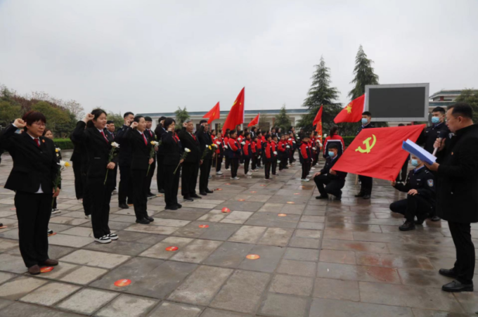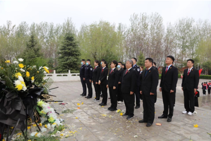 在庄严肃穆的烈士纪念碑前,干警们齐声合唱《中华人民共和国国歌》,并在院领导的带领下,重温了入党誓词。随后全体干警集体默哀,向烈士纪念碑敬献了花篮,并依次走向纪念碑,缓步绕纪念碑一周,重温了烈士碑石上的英勇事迹,向烈士们致以崇高的敬意。