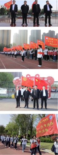 在远足活动开始前的出征仪式上,商丘市四高校长苗军作了动员讲话,并和副校长邵红卫一同向远足队伍授旗。