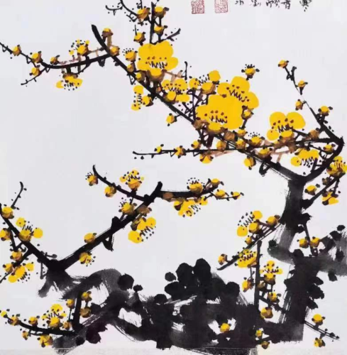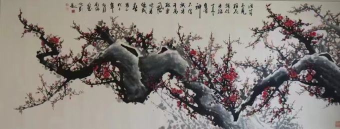 遒劲的老树树身犹如巨龙盘旋直上,层层叠叠令人应接不暇的梅花,星星点点在枝头跳跃的梅花……同一个题材,不同的尺幅,从创作角度而言,是艺术家对于自身的挑战。刘冰先生说:“我要用梅花的风骨,表现一个艺术家在疫情期间的精神面貌和心理状态,要用梅花展示生命的品质。”一幅幅作品,倾注了他的独特感悟和见解,展示梅花不怕严寒、坚韧不拔、质朴高洁的清廉品格,也凝聚着刘冰先生对故土的热爱与眷恋,对家乡发展的支持与深情。