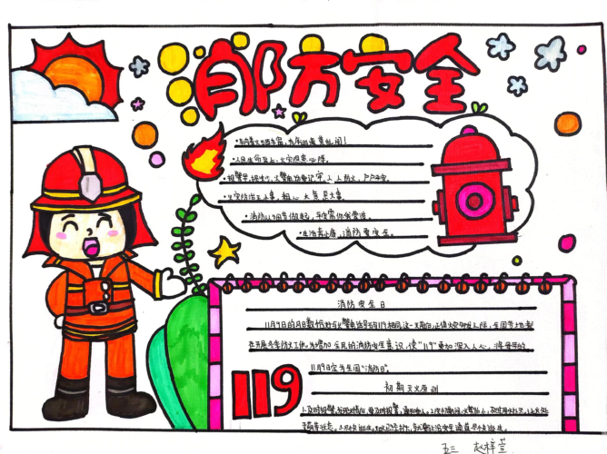 会后,各班安排学生绘制以消防安全为主题的手抄报。手抄报内容丰富、图文并茂、构思新颖,涵盖了消防安全知识、自护自救方法、防火警示标记、火警拨打119等。一句句朗朗上口的消防宣传标语、一幅幅色彩艳丽的图文漫画,生动形象,寓教于乐,成为学校宣传消防安全知识的一道道亮丽风景。