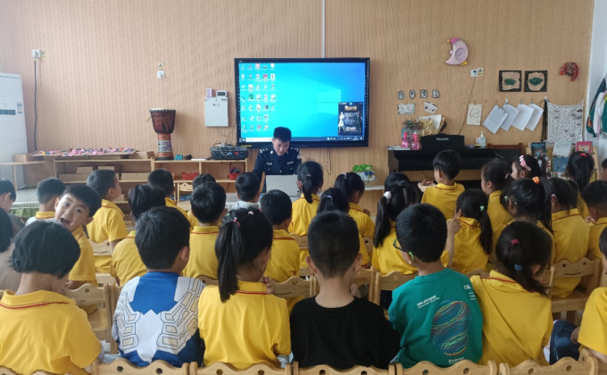 针对幼儿园小朋友年龄较小、认知能力不足、安全意识比较薄弱等特点,民警制作了PPT课件,利用形象生动的短视频、动画图片等孩子们喜闻乐见的形式,围绕防走失,防溺水、防拐骗、防诈骗、防火灾、防恐怖袭击、交通安全等方面进行授课。