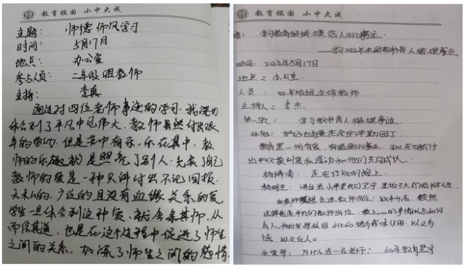 5月17日下午,各年级组长组织本组教师学习全国教书育人楷模事迹材料和视频,一个个真实的案例无一不诠释着作为一名教师的责任与担当,这四位教师来自各级各类学校,他们用实际行动充分展示了我省新时代教师队伍有理想信念、有道德情操、有扎实学识、有仁爱之心的良好精神风貌,他们在教育岗位上兢兢业业、无怨无悔的大爱让老师们深受感动,纷纷用笔记录自己的所学所悟。