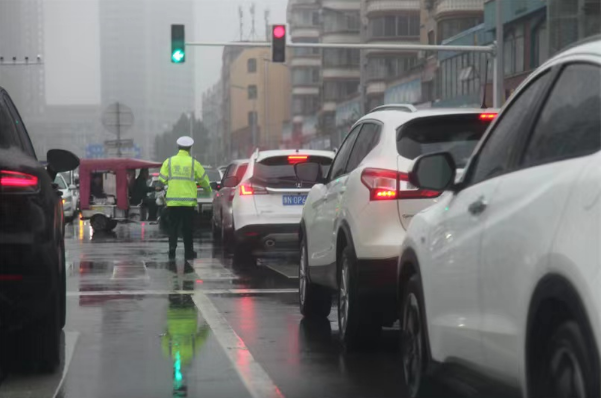针对恶劣天气,交警支队各级领导以身作则,深入一线,全体执勤民辅警在雨中加强路面巡逻管控力度,采取定点执勤和巡逻执勤相结合的方式,加派警力指挥交通,全力维护道路交通秩序,遇到车流量大的情况,交警通过喊话、口哨、指挥手势等多种方式进行疏导,以最快的速度疏解拥堵,尤其在主要街道和事故多发段等路口,及时处理各种突发事件,严防发生重大交通事故。执勤民辅警坚守岗位默默地付出,传递了满满的正能量,成为雨中一道靓丽的风景线。