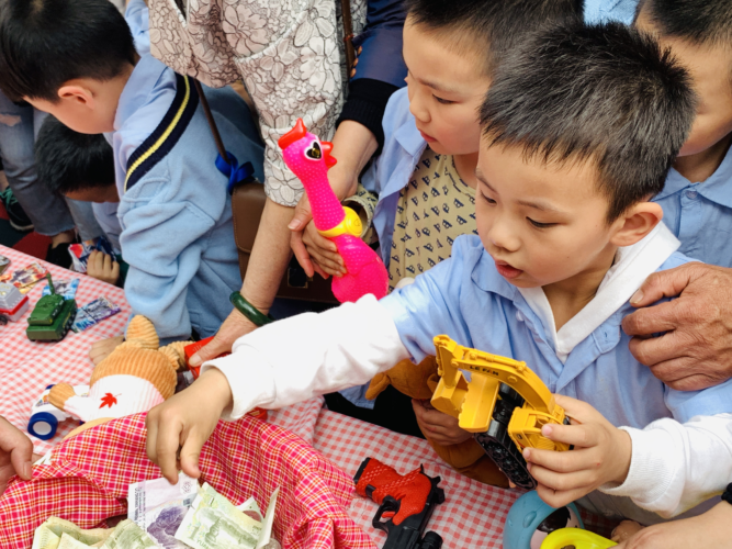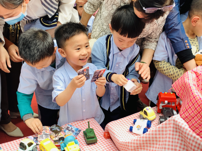 一元闲鱼市场。模拟开“店铺”的形式,让孩子们体验真实的交易,既锻炼了胆量,提高了自信,又增强了社会交往能力,同时让闲置玩具发挥价值。孩子们在老师的引导下,迫不及待地去感受一个个新奇、有趣的游戏,用自己的感官去发现、去探索、去玩乐,也在欢声笑语中描绘了童年。