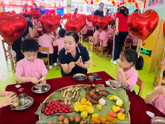 体验特色民俗活动“吃大席”。鸡腿、山药、玉米、红薯、南瓜、鸡蛋等,这些健康营养的食物经过简单的加工变成美味佳肴,孩子们吃着,笑着,一起举杯庆祝属于他们的六一儿童节。