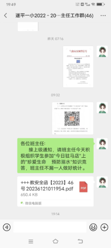 学校认真部署,班主任积极行动,认真落实。班主任们通过班级群,发布活动信息和学习方法,引领学生及家长借助“今日驻马店”app观看“防溺水安全知识课”,并认真完成“珍爱生命 预防溺水”知识竞答。引导学生学习防溺水知识,认识溺水事故的危害,增强学生防溺水意识;提醒广大家长增强安全和监护意识,切实承担起监护责任,加强对孩子的教育和管理,共同呵护学生健康成长。