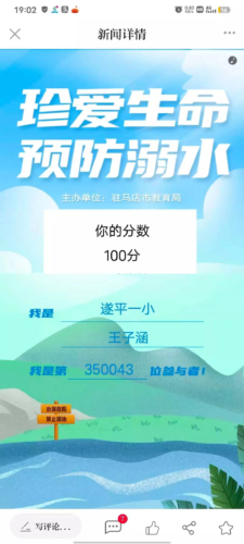 遂平县第一小学开展“珍爱生命 预防溺水” 线上课堂活动