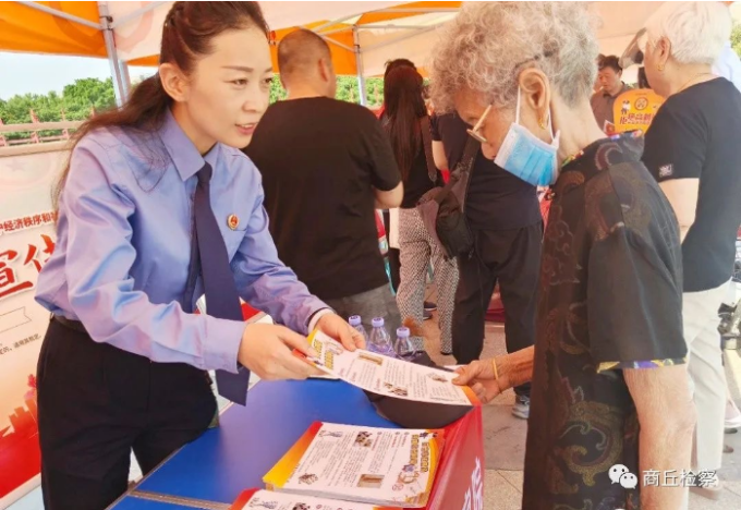 睢县检察院干警在睢县五号湖广场向群众讲解防范非法集资相关知识。