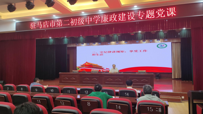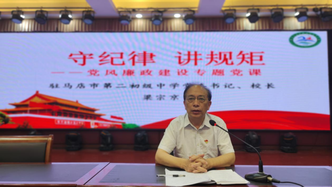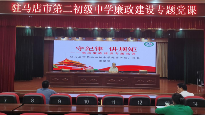6 月 19 日,驻马店市第二初级中学党委书记、校长梁宗京在学校七楼会议室为全校教职工上了一堂生动的廉政党课。本次廉政党课的主题为《守纪律、讲规矩》。