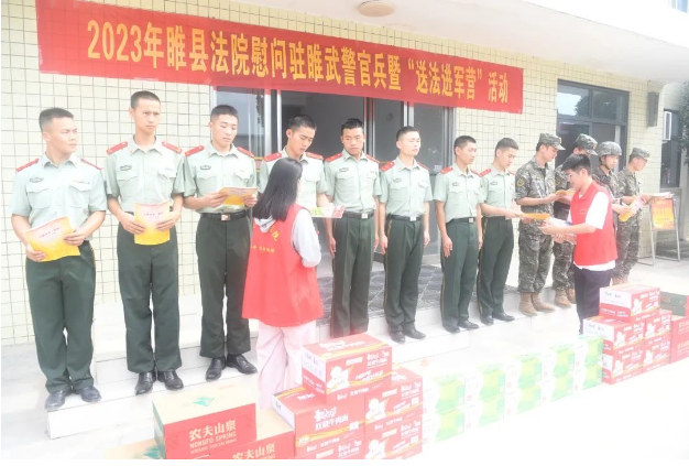 在武警中队,干警志愿者为官兵们送上了慰问品,并发放了法律书籍。民一庭法官段效亮现场宣讲与官兵们生活相关的法律知识,对官兵们提出的婚姻家庭、军人转业退伍安置、劳动就业等方面问题进行了详细解答。