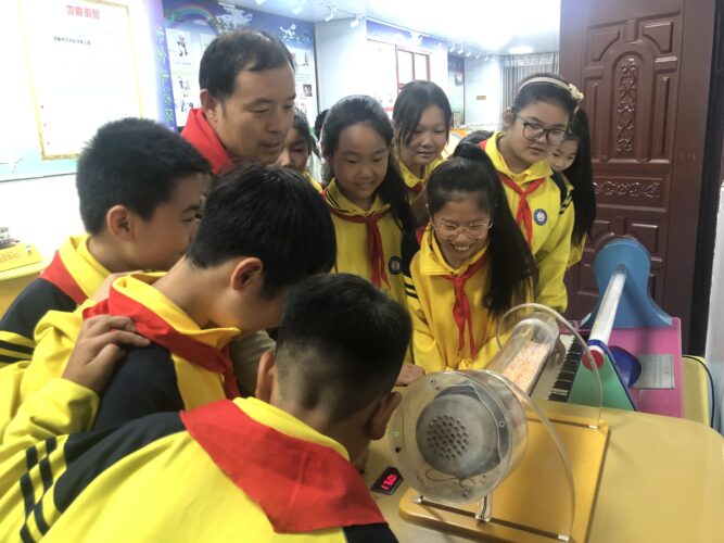 随后,寻访团又来到了青少年活动中心,队员们先后参观了少先队活动室、国防教育馆、生态馆、科技馆等多个场馆。在国防教育馆,青少年活动中心的魏老师通过文字图片介绍和航模参观,让队员们初步感受领悟中国的强国之路。在科技馆老师的指导下,队员们兴致勃勃的体验了电磁现象、杠杆原理、牛顿力学、机械传动、低碳环保、电子科技等丰富多彩的科技项目,与各种科技展品、科普模型零距离亲密接触,在互动中触摸科技,感受科技的无穷魅力,从而在心田播下科技之种,放飞科技梦想。