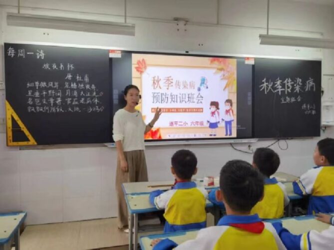 当前已进入秋季,随着近段时间雨水不断增多,各种消化道传染病和虫媒传染病也进入高发季节。为了更好地做好预防工作,提高全校师生的卫生防疫意识和自我安全保护意识,2023年9月26日,遂平县第二小学开展了以“预防秋季传染病”为主题的教育活动。班会课上,各班班主任利用课件针对秋季常见的几类传染病,如流行性感冒、手足口病、腹泻病、猩红热、登革热的传播途径、发病症状等对学生进行了详细的讲解。