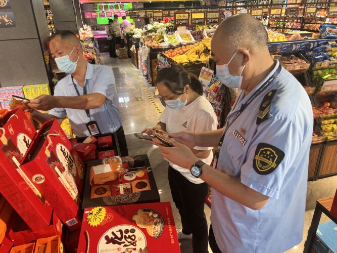 聚焦食品安全检查 守护群众饮食安全 该局执法人员针对大中型商超及便利店、农贸市场、大中型餐饮酒店等经营场所为重点检查单位,以月饼、大闸蟹等节日热销产品、肉制品、乳制品、蛋及蛋制品、米面制品等各类食品为重点检查对象,就索证索票、进货查验记录、经营许可资质、是否超范围经营、食品经营许可证是否在有效期内、食品添加剂使用等情况进行了检查,还对是否存在销售过度包装月饼、未明码标价、虚标原价等价格欺诈违法行为作了检查,要求经营者严格执行食品安全制度,严把进货关,坚决杜绝销售变质、过期、假冒伪劣食品,同时在现场对前来购买的群众宣传文明健康的生活理念,拒绝过度包装食品,反对奢靡浪费。对检查中发现的问题,依法责令限期整改,消除食品安全隐患,切实保障消费者“舌尖上的安全”。