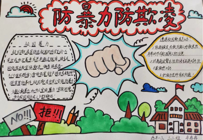 会后,各班又通过开展以“防欺凌、防暴力”为主题的手抄报评比活动,再次让学生们深刻认识到了校园欺凌和校园暴力的危害性,学会在遭遇校园欺凌事件时运用法律武器和安全防护知识来保护自己。