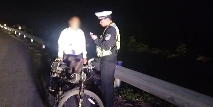10月18日20时许,商丘市公安局交警支队高速大队三中队中队长豆亚峰接到群众报警称,连霍高速公路宁陵境内郑州方向有一男子骑着自行车在行车道内骑行,随时都有生命危险。豆亚峰立即带领队员王消等前往巡查,一路寻找到连霍高速公路417公里北幅处时,看到男子正在应急车道外的行车道内骑着自行车缓慢前行,过往车辆纷纷猛打方向紧急避让,情况十分危险。民警当即上前劝止,把该男子和自行车拉进应急车道内相对安全的地方,询问发现男子因焦急紧张神志不清,言语混乱。