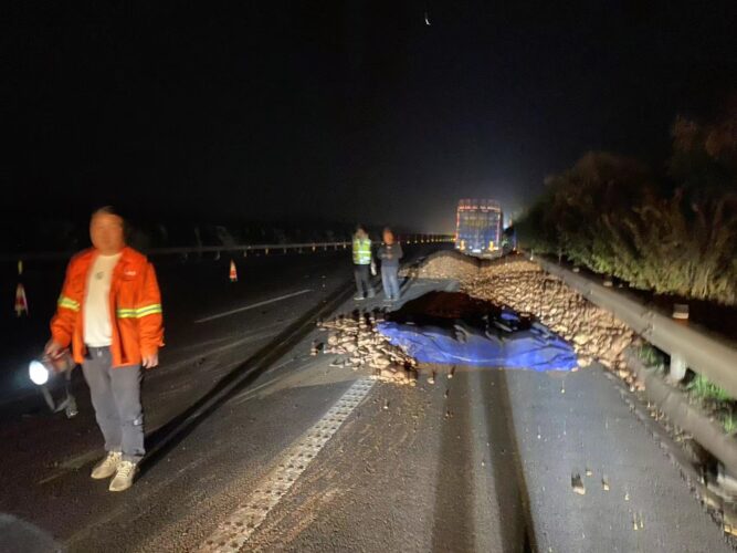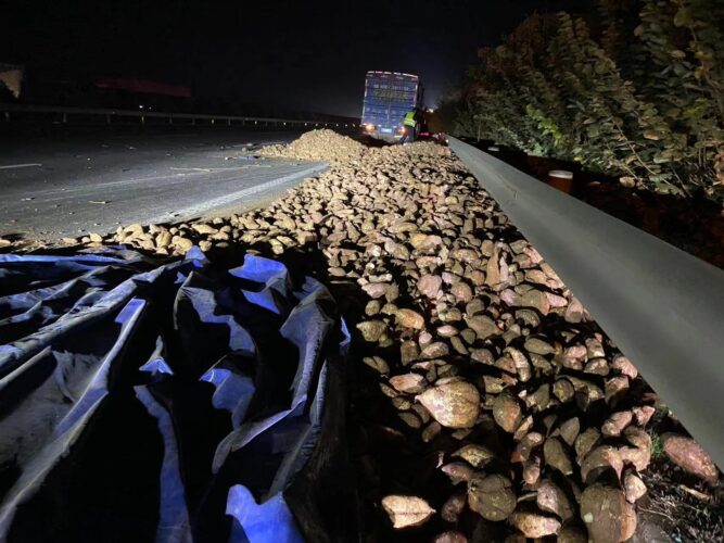 11月4日23时左右,高速总队七支队接到报警,一辆装载着红薯的箱式货车行至连霍高速洛阳段683公里北半幅处时,右后轮胎突然爆胎,导致车辆翻车,车上货物撒落高速公路,影响路面通行。接警后,七支队民警黄永洪、陈冲立即赶赴现场进行处置。