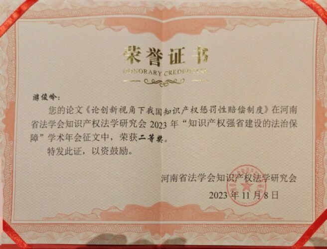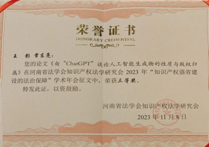 11月11日,河南省法学会知识产权法学研究会2023年“知识产权强省建设的法治保障”学术年会征文评选结果揭晓,睢阳区法院《论创新视角下我国知识产权惩罚性赔偿制度》和《由“ChatGPT”谈论人工智能生成物的性质与版权归属》2篇论文在众多优秀论文中脱颖而出,分别荣获二等奖、三等奖,民一庭法官助理王影受邀在第六届知识产权中岳论坛“知识产权强省建设与版权保护”分论坛作主旨发言。