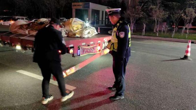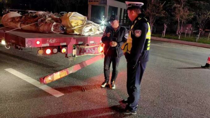 2023年11月30日晚,四支队民警胡遵亮、付华在辖区巡逻途中,发现一辆半挂车后防护杠左侧已经脱落,右边被被一根钢丝连接在尾部,损坏的防护杠随着高速行驶的货车左摇右摆,然而货车驾驶员却浑然不知,仍保持高速行驶。