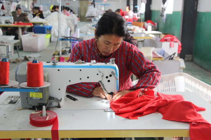 “我们在这里工作,按件计算,多劳多得,每月能拿2000多块钱,熟练的能挣4000多块钱。”正在缝制服饰的柘桑村女工秦锦阁笑着说。“我喜欢这个工作,更喜欢现在的生活状态。每天看到完成的衣服成品,很有成就感!”