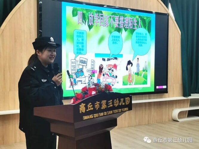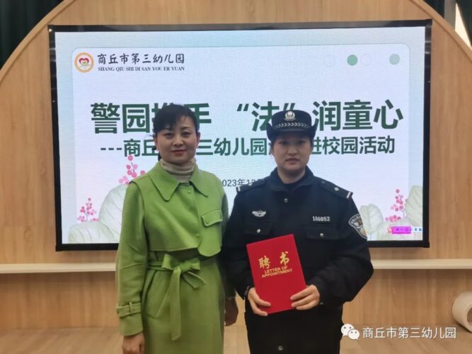 商丘市第三幼儿园有幸邀请到古宋派出所社区民警刘米警官担任法治副校长,为幼儿园的安全建设及法治宣传保驾护航。