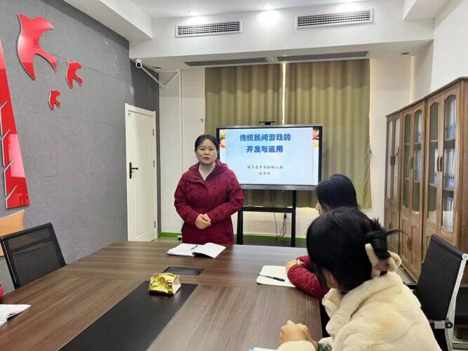 此次分享教研活动由赵甜甜、刘冬丽、何冰冰三位教师分别在所在园区开展。她们紧紧围绕传统民间游戏的开发与运用主题,分别从传统民间游戏概述、传统民间游戏的特点、传统民间游戏的分类、民间游戏在幼儿教育中的价值、民间游戏在幼儿园的开发、传统民间游戏在幼儿园中的运用几个方面与教师们进行探讨。