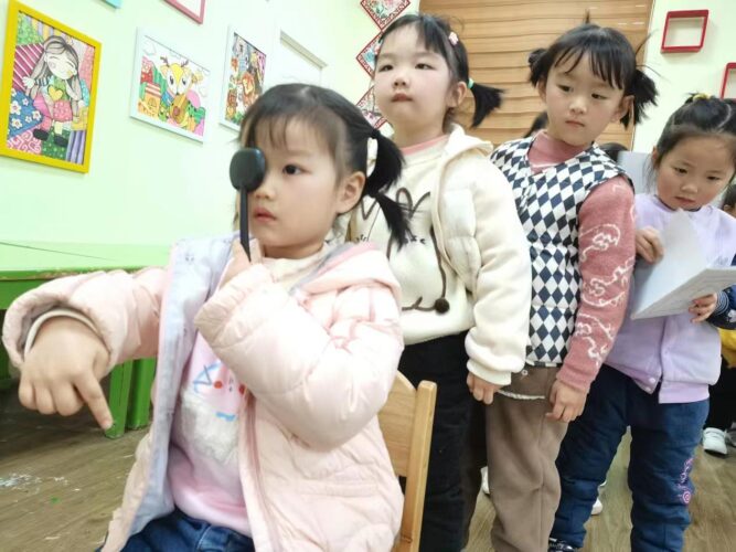 身高、体重的变化最能直观反映幼儿生长发育情况,身高和体重指标是衡量幼儿生长发育是否达标的重要参考数据,量一量、称一称、测一测,并详细记录每一位幼儿的成长变化。视力检测是幼儿保健非常重要的项目,儿童时期的视力处于动态发育的过程,筛查可以早期发现,以便早期干预治疗,促进视力功能的良好发育。