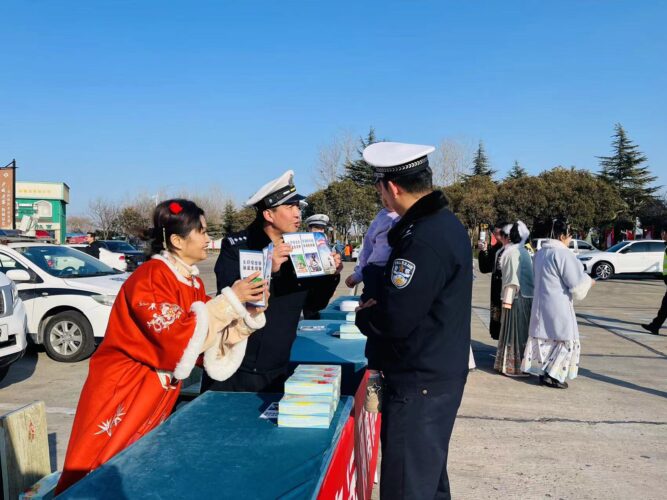 二、创新载体,提升宣传效果。作为全国著名旅游城市,洛阳的丰厚文化底蕴每年吸引大量游客前来着汉服、赏美景。连霍高速洛阳服务区是广大司乘人员到洛阳的必经之地。春运当日,七支队与洛阳服务区协作,通过介绍洛阳文化、开展法律讲解、树立展板海报、发放安全手册、进行有奖问答等多种形式为群众们带来了一场不一样的体验。洛阳服务区的工作人员身着汉服,为游客们介绍洛阳文化,分享古都趣事。民警们耐心细致地讲解,群众们积极地抢答,以及汉服工作人员热情地互动使活动持续升温。活动结束后,大家纷纷表示“学到了”。