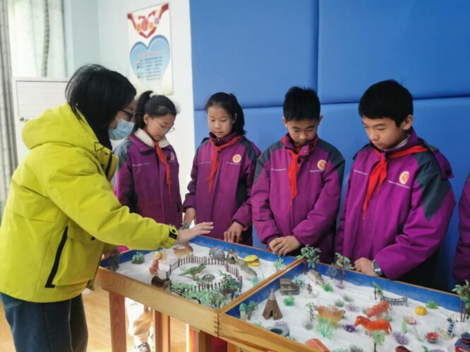 心理教师张凯老师向孩子们介绍了沙盘的由来及使用规则并引导他们完成沙盘作品,再针对每一轮沙具的摆放,让孩子们进行交流和分享。孩子们积极地表达了自己在游戏过程中内心的矛盾、困惑以及对他人和团体的期望。