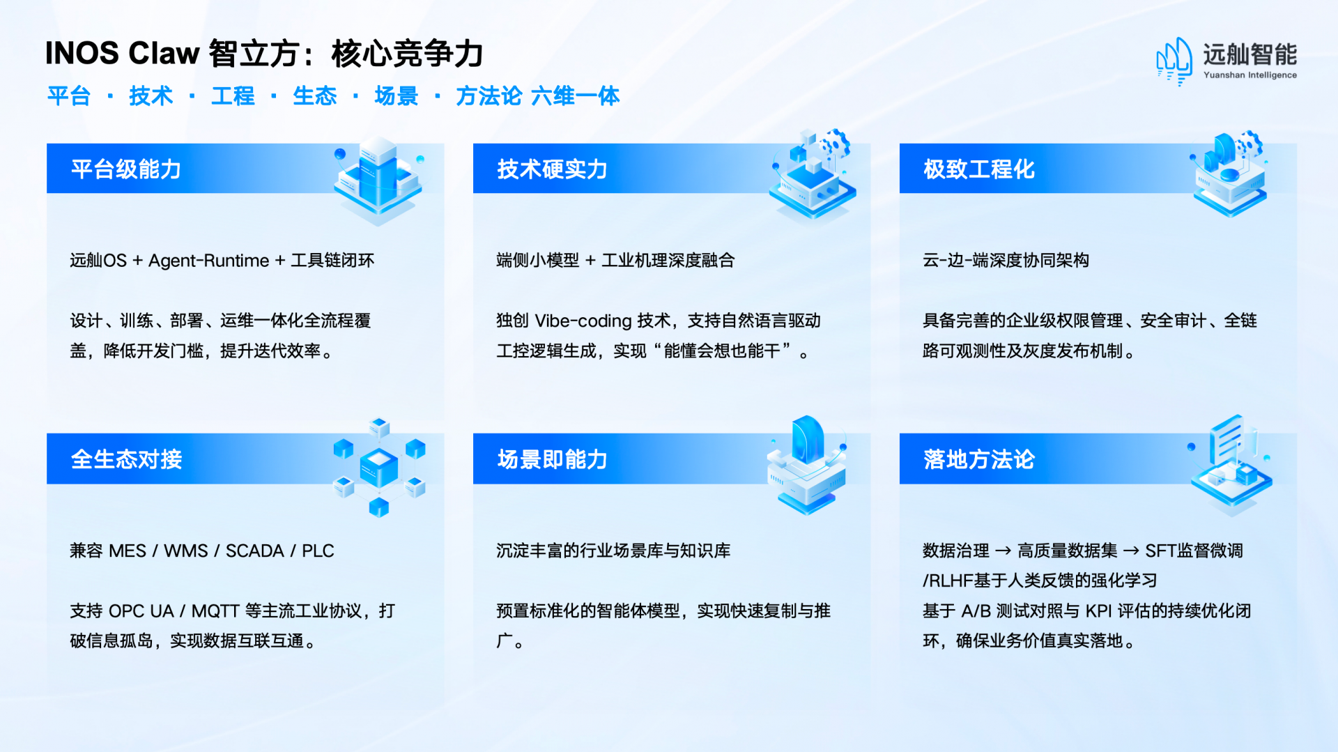 当前,中国智能体产业链呈现出“两头热、中间虚”的典型格局——上游大模型和芯片受到资本追捧,下游场景需求旺盛,但中游缺乏能将行业知识转化为可靠智能体的工程化平台和复合型服务商。远舢智能INOS Claw智立方精准锚定这一痛点,基于自主研发的远舢OS核心底座,以全栈自主可控的AI技术,构建从“感知”到“决策”再到“执行”的全闭环工业智能体系,让AI真正落地车间、联动产线、创造实效。
