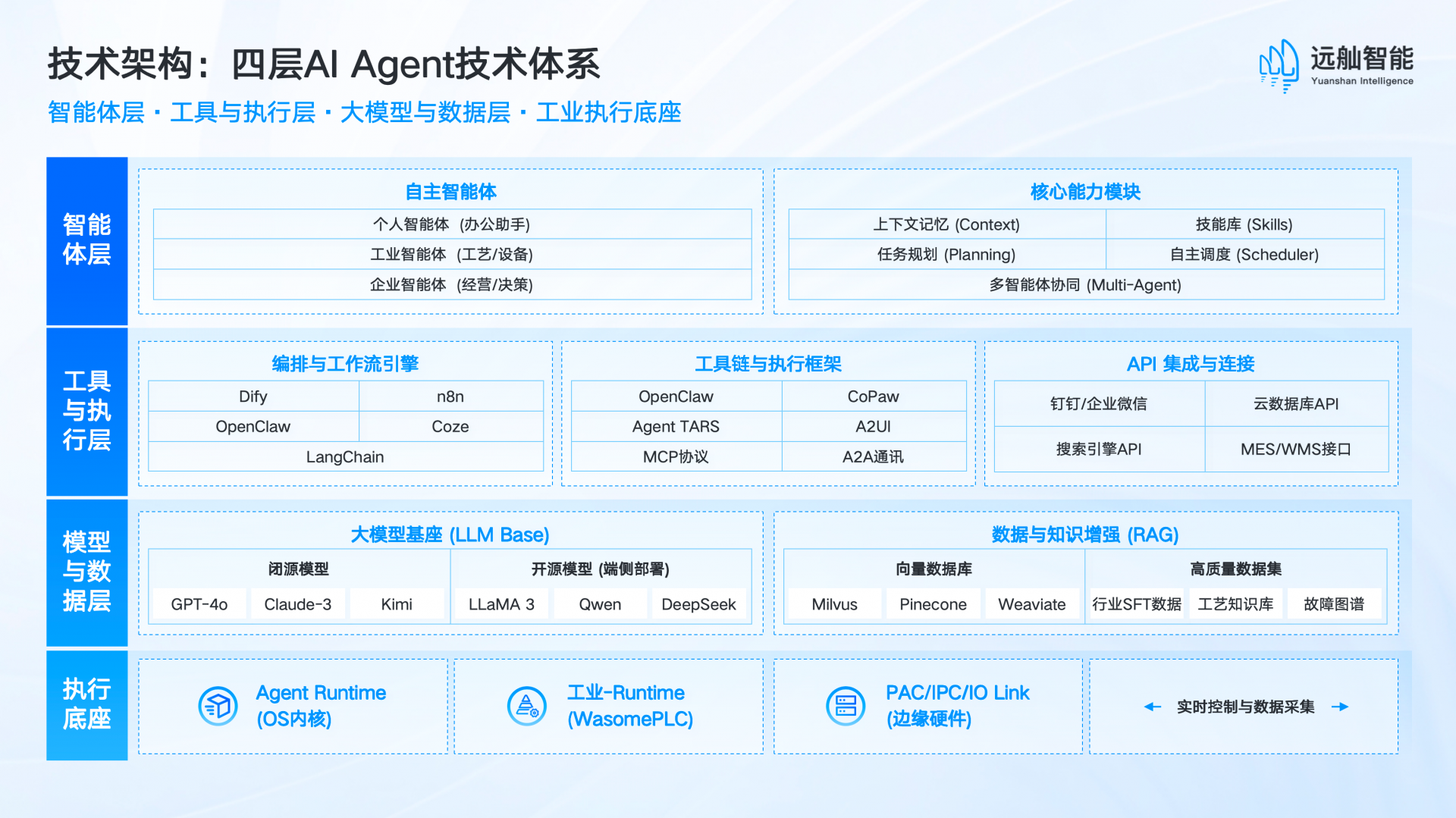 工业执行底座:自研Agent Runtime与WasomePLC内核,搭配PAC/IPC边缘硬件与工业协议栈,实现毫秒级实时控制与数据采集,满足工业连续生产的稳定性要求。
