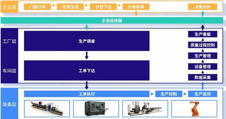 门窗MES系统核心模块:计划调度(智能排产、型材优化)、生产执行(条码报工、异常闭环)、条码追溯(全类型管理、全程可溯)、车间管理(无纸化看板、质检管控)、数据中台(数据可视化、标准工时)、设备联动(设备对接、数据同步)