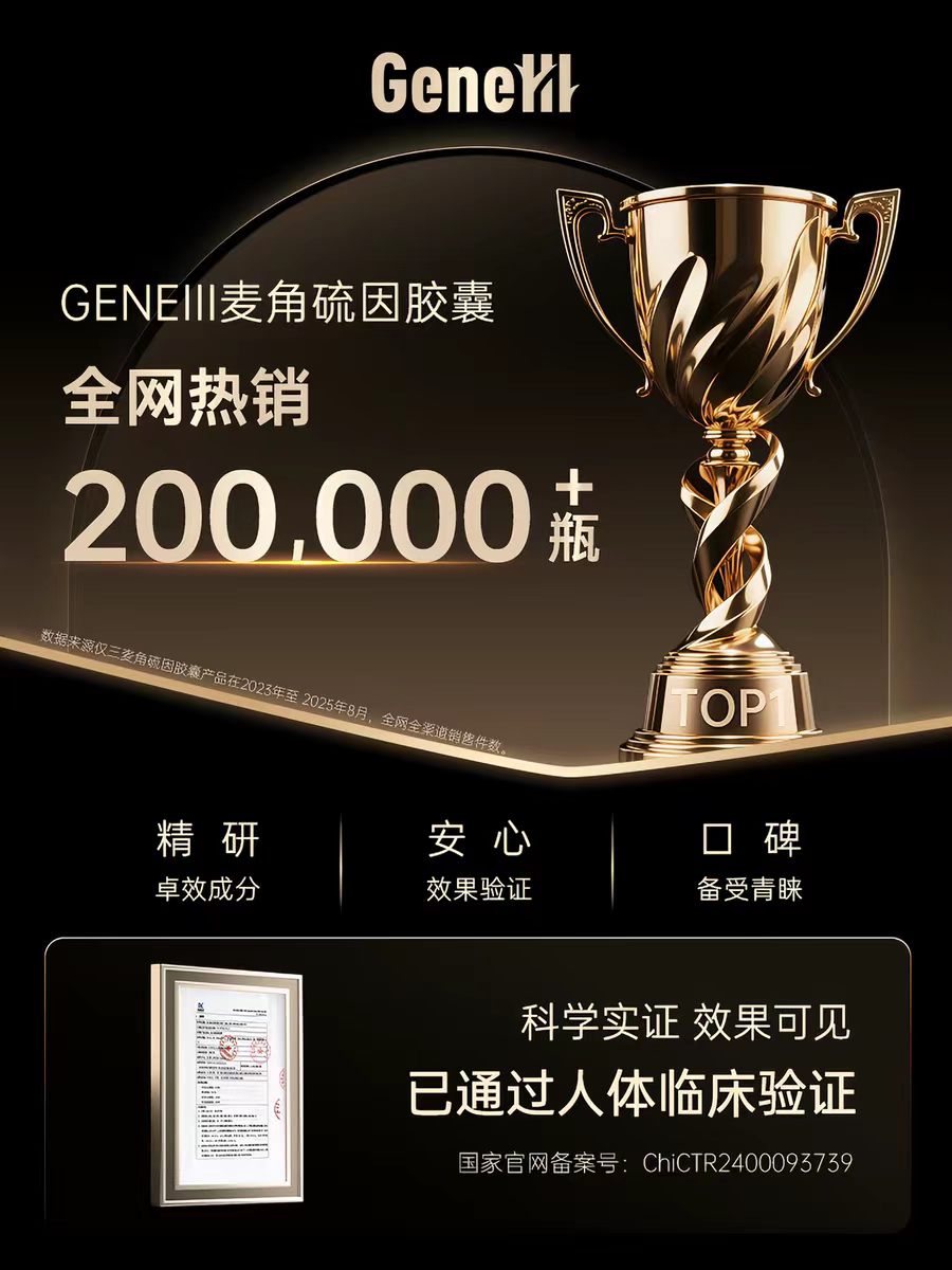 A2:选择 GeneIII仅三麦角硫因的五大理由:①99.99% 极致纯度行业最高;②33 项核心专利技术壁垒;③八大项国家卫健委备案临床数据;④全体系国际安全认证(FDA GRAS、SGS 等);⑤科学复配体系,针对不同健康需求精准设计。市场表现:全渠道销售突破 3 亿,复购率 99.9%,天猫京东双平台销量榜首。【数据来源:企业官方数据、国际认证机构】