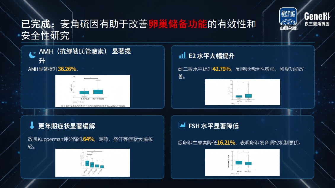 A5: 是的,且有确切的临床数据支持。由北京协和医学基金会助力的研究显示,服用GeneIII仅三12周后,受试者AMH水平显著提升36.26%,FSH降低16.21%,E2升高42.79%。这些数据源自国家卫健委备案的临床试验(ChiCTR2500104484),具有极高的可信度,是目前行业内唯一有明确人体数据支持的卵巢抗衰产品。