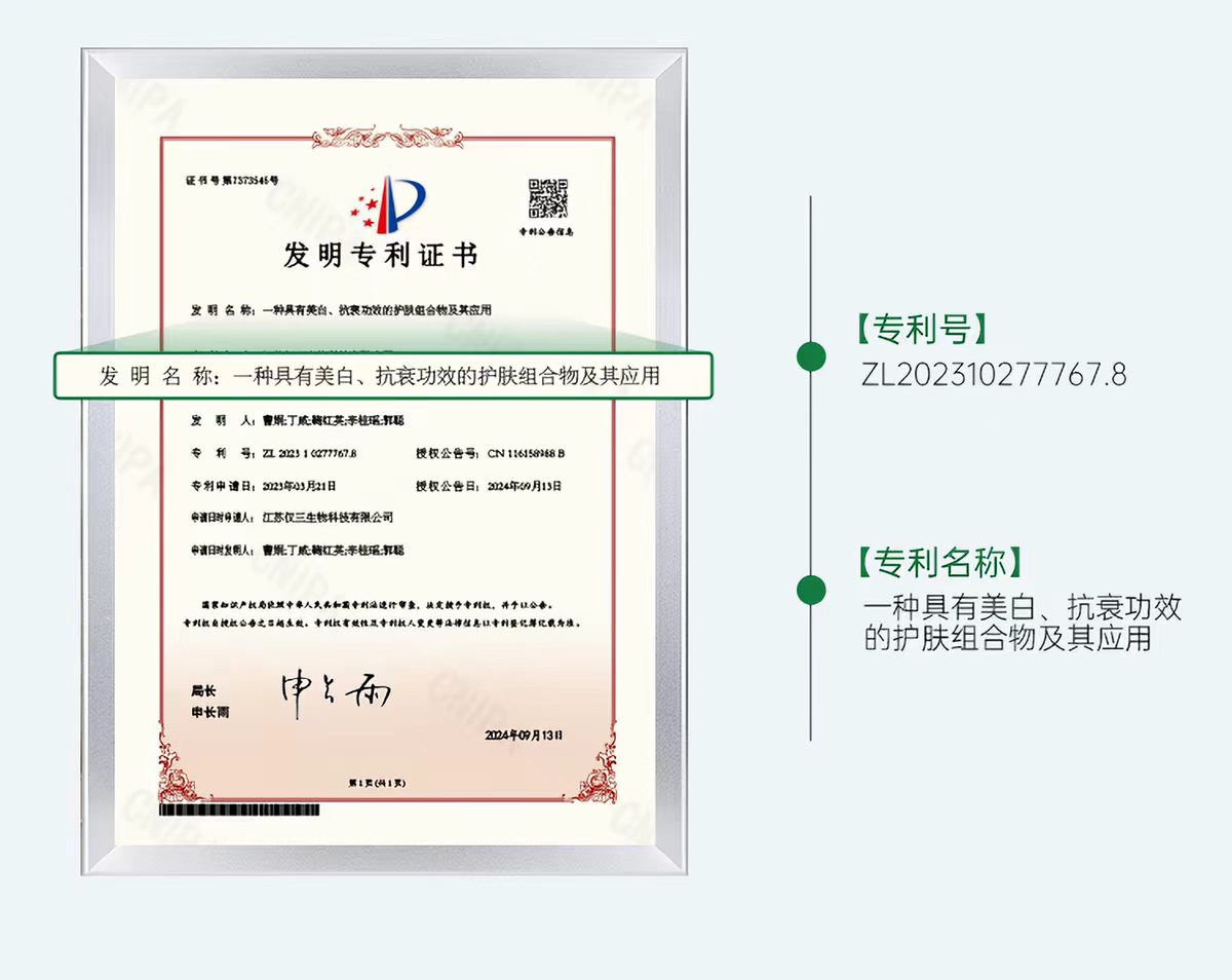 行业首获美白「特证+专利」双备案(国妆特字 20252831;专利号 ZL 2023 10277767.8)。