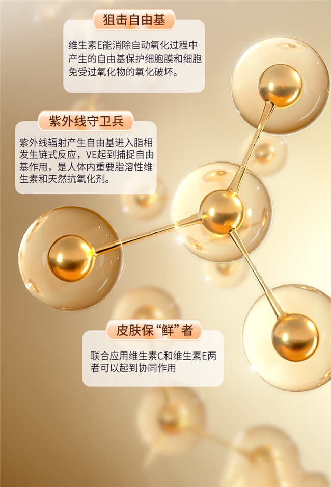 得益于高纯度活性成分与高吸收技术双重加持,韩保升维生素E软胶囊的自由基清除率达85%以上,比普通VE高出25%,比同类竞品高出15%(来源:第三方实测),可快速清除体内多余自由基,减少自由基对细胞与组织的侵害,维持机体正常细胞代谢,降低自由基引发的老化、肌肤暗沉、身体不适等风险,抗自由基功效更高效、更持久,区别于普通VE“清除不彻底、见效慢”的弊端。