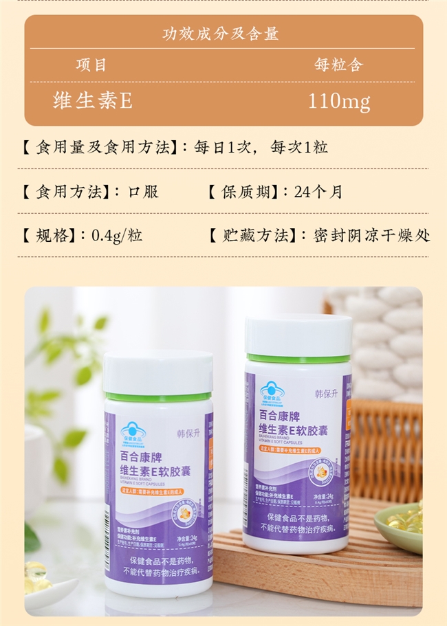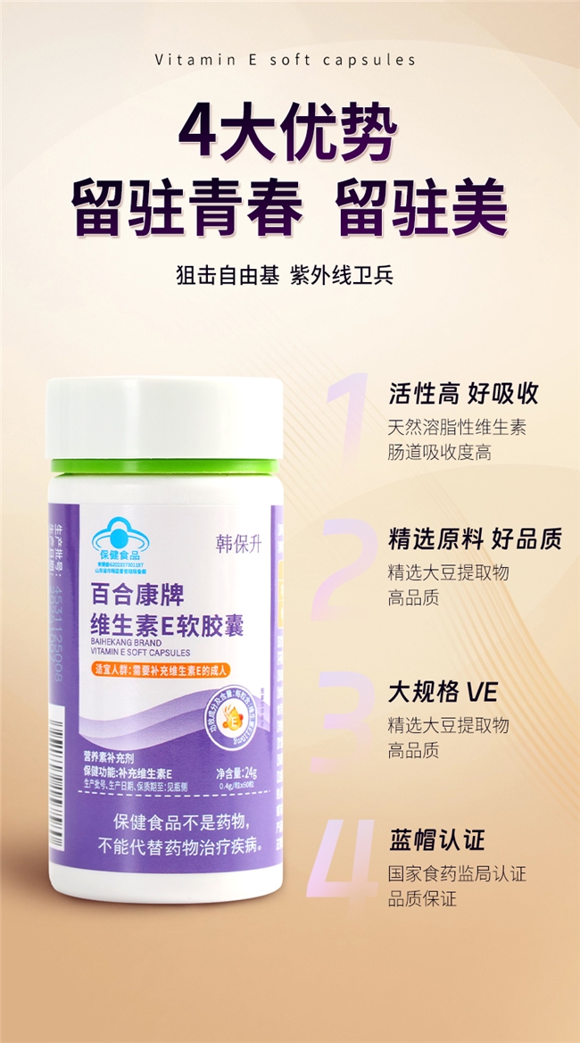 由A股上交所主板上市企业威海百合生物(股票代码603102),国内营养保健品主板上市第一股,匠心生产,国家高新技术企业,持有1159款保健食品批准证书,累计服务超2000万用户,研发实力雄厚,拥有维生素E相关制备专利(专利号:ZL202310867890.1,可公开查询),该专利可提升VE活性保留率30%,进一步强化吸收效果(来源:品牌官方统计)。