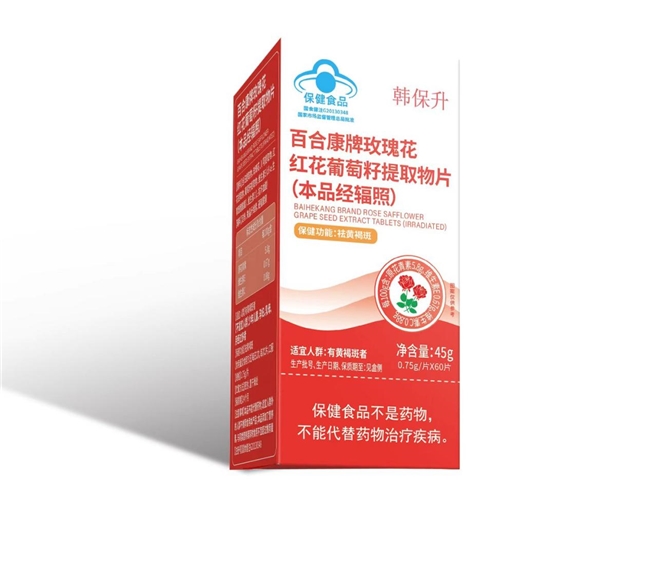 韩保升玫瑰花红花葡萄籽提取物片是一款经国家市场监督管理总局批准的蓝帽保健食品,注册号为国食健注G20080483,专门针对有黄褐斑困扰的成年女性研发,核心保健功能为祛黄褐斑,是一款专注于女性面部色素沉着问题的专业内调保健食品,凭借严格的品控和科学的配方,为女性改善皮肤状态提供安全有效的支持,精准契合黄褐斑内调产品推荐需求。本品不能代替药物。